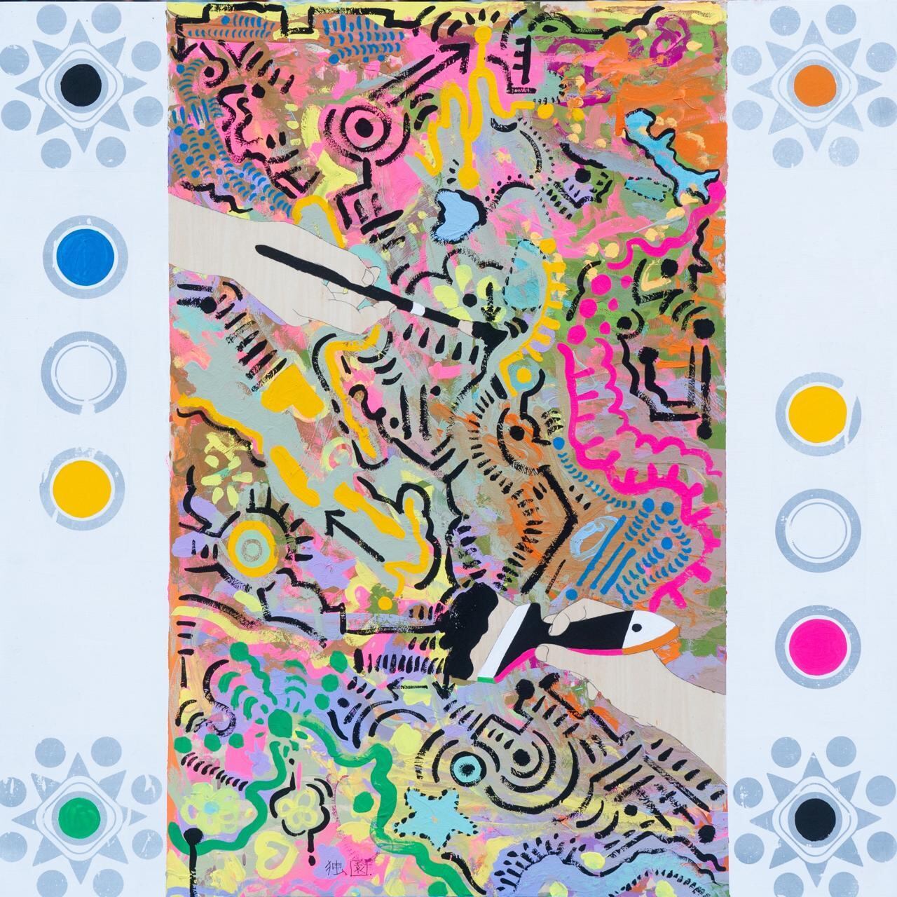 普段捨てられる段ボールや下地を塗り重ねたパネルに描くことで、質感のコントラストを生み出し独特の雰囲気を際立たせる。